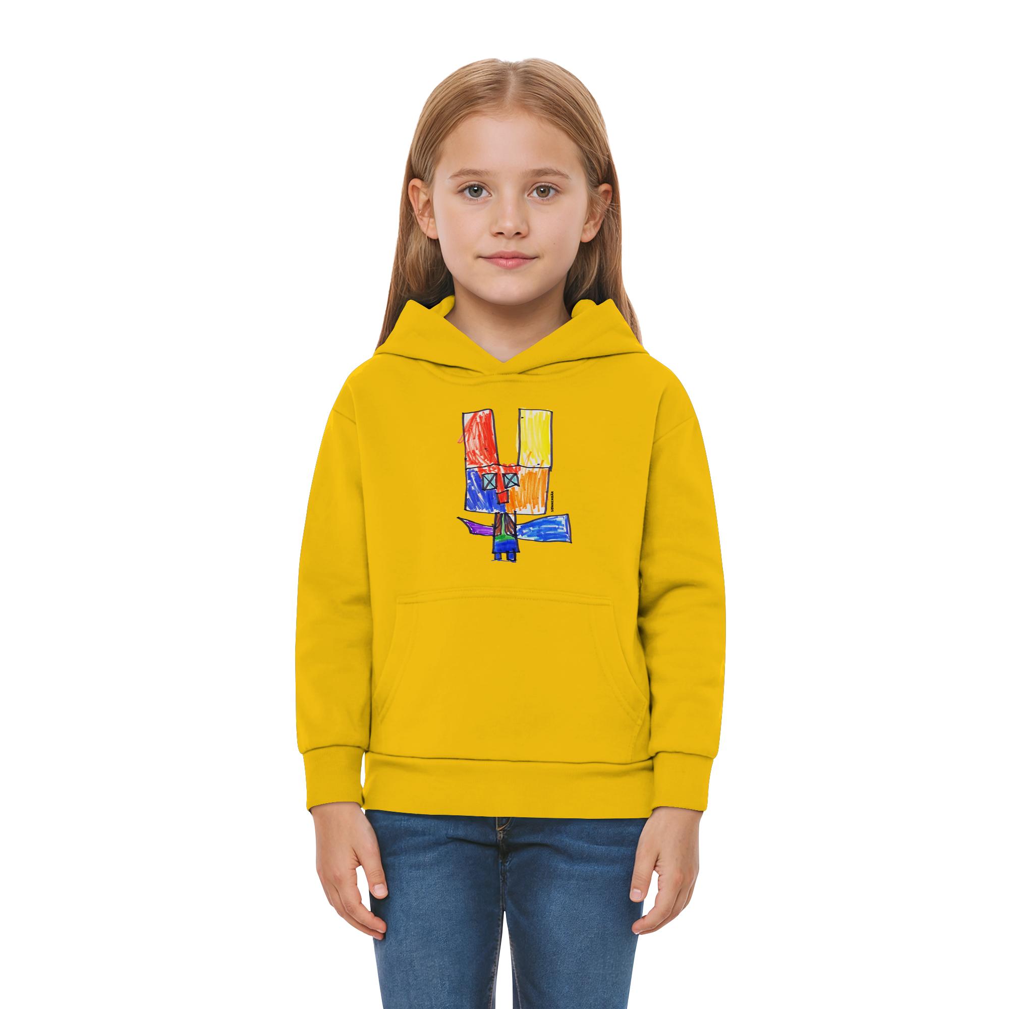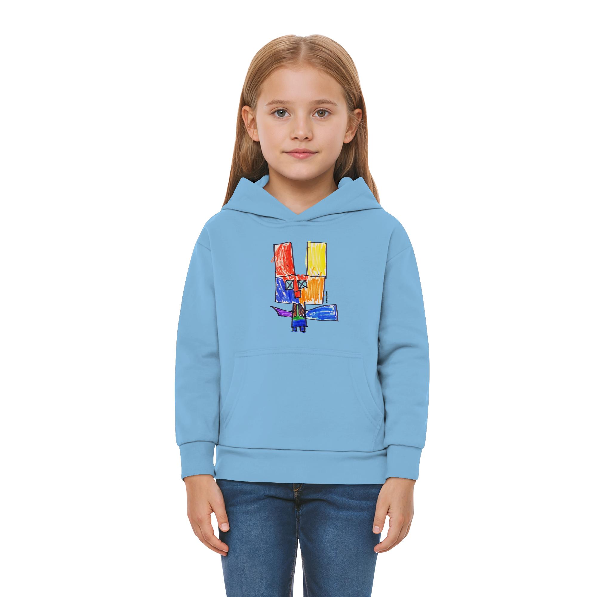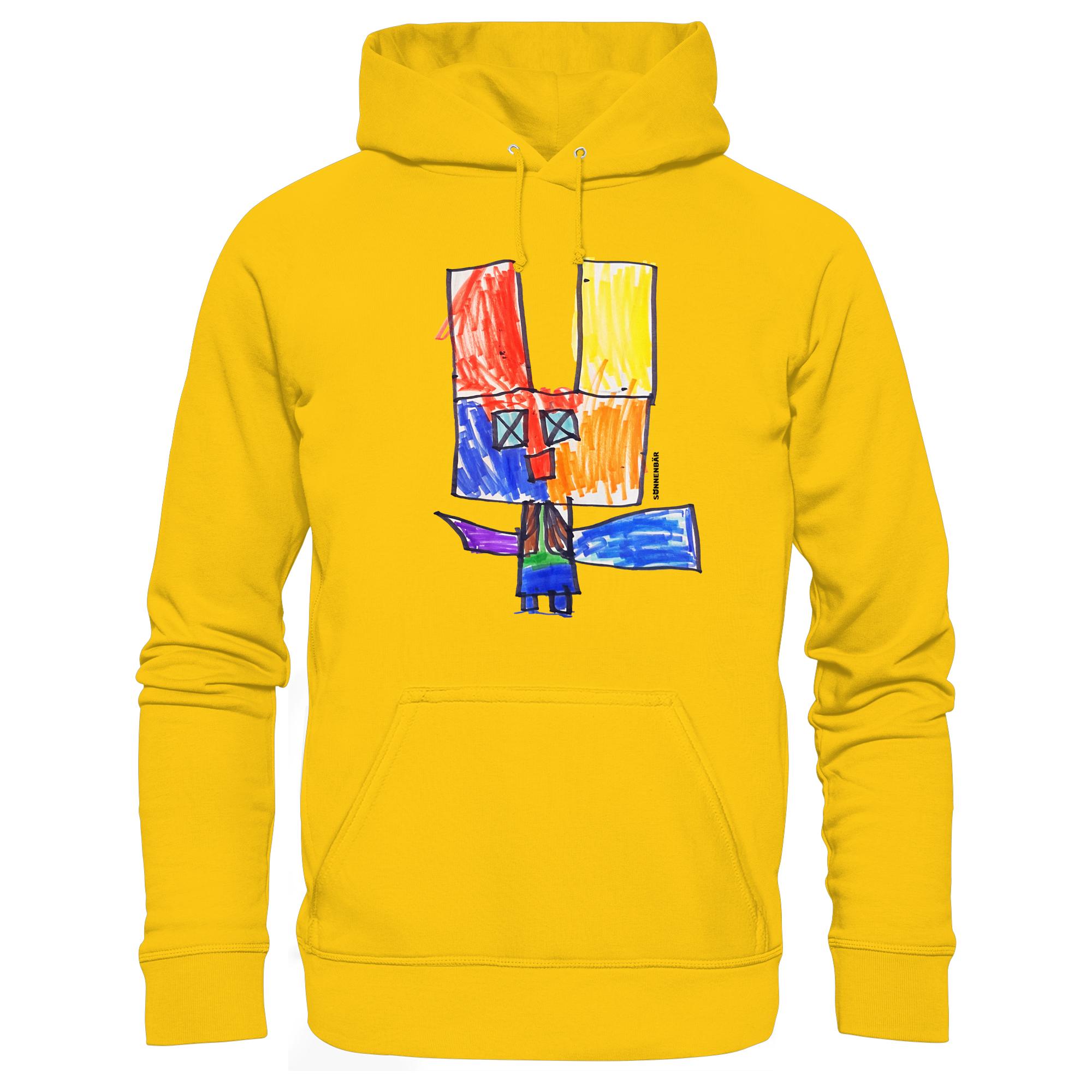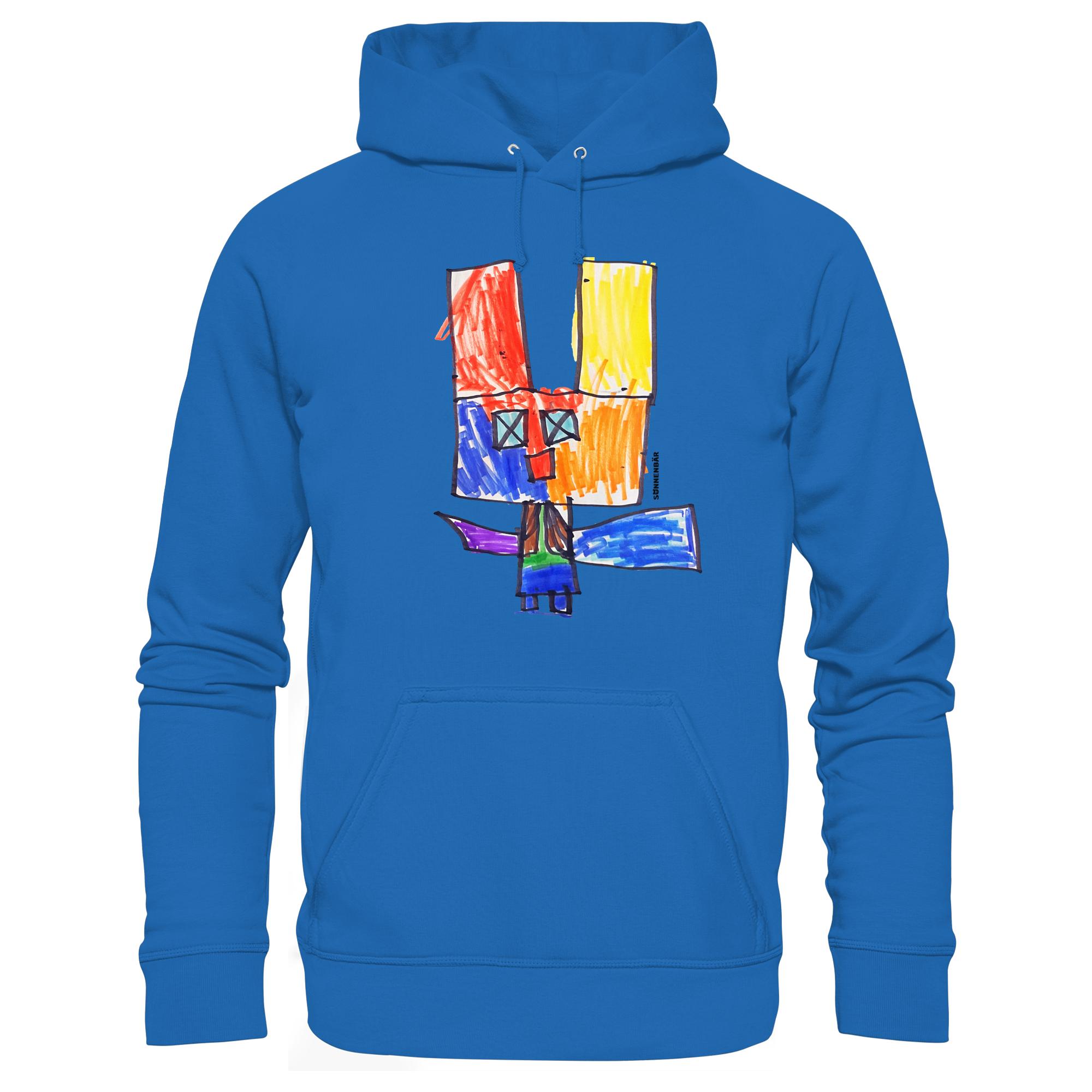 Der Hoodie zeigt ein einzigartiges, handgezeichnetes Motiv mit leuchtenden Rot-, Gelb- und Blautönen. Diese Farben harmonieren perfekt und strahlen Optimismus aus. Jeder Farbton erzählt seine eigene Geschichte – von Abenteuerlust bis hin zu Geborgenheit.